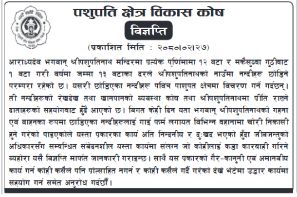 पशुपतिनाथ मन्दिरमा प्रत्येक पूर्णिमामा १२ वटा र मकैसुब्बा गुठीबाट १ वटा गरी वर्षमा जम्मा १३ वटाका दरले नन्दी छाड्ने परम्परा रहेको छ। तर त्यसरी छाडिएको साँढेहरु गाई फार्म लगायत विभिन्न बहाना बनाएर चोरी निकासी हुने गरेको पाइएको छ। कोषले शनिबार विज्ञप्ति जारी गरी केही दिनयता विभिन्न बहानामा गाई फार्म लगायत विभिन्न बहाना बनाएर नन्दीको चोरी निकासी हुने गरेको पाएको भन्दै यस प्रकारको कार्य नगर्न चेतावनी दिएको छ।