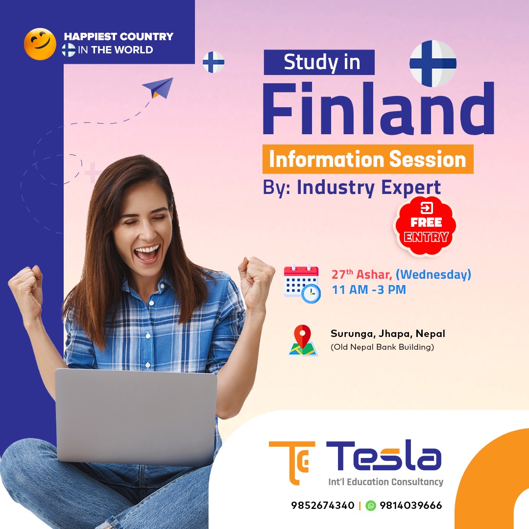 टेसला इन्टरनेशनल एजुकेशन कन्सल्टेन्सीले आयोजना गरेको सेमिनार सुरुङ्गा स्थित नेपाल बैंक बसेको पुरानो भवनमा संचालन हुने जनाइएको छ । संसारकै सबैभन्दा समृद्ध मुलुकको सूचीमा पर्ने उत्तर युरोपेली देश फिनल्याण्डको विशेषताका बारेमा सम्बन्धित विषयका विशेषज्ञहरुबाट सेमिनार संचालन हुने कन्सल्टेन्सीका प्रवन्ध निर्देशक मीलन ओलीले जानकारी दिए । यहि असार २७ गते बुधबार (भोली) बिहान ११ बजेदेखी दिउँसो ३ बजे सम्म संचालन हुने सेमिनारमा फिनल्याण्ड किन जाने साथै यसको आर्थिक पक्षका बारेमा समेत विस्तृत जानकारी गराइने प्रवन्ध निर्देशक ओलीले बताए । विगत २० वर्षदेखी शैक्षिक सेवा साथै १० वर्षदेखी शैक्षिक परामर्श सेवामा आफ्नो सम्पूर्ण समय खर्चिएका ओली सामाजिक क्षेत्रमा समेत त्यतिक्कै क्रियाशिल छन । नेपाल शैक्षिक परामर्श संघ (इकेन) झापा शाखाका अध्यक्ष समेत रहेका ओलीले अब कनकाईको सुरुङ्गामा समेत कन्सल्टेन्सीको सेवा विस्तार गर्ने भएका छन् ।