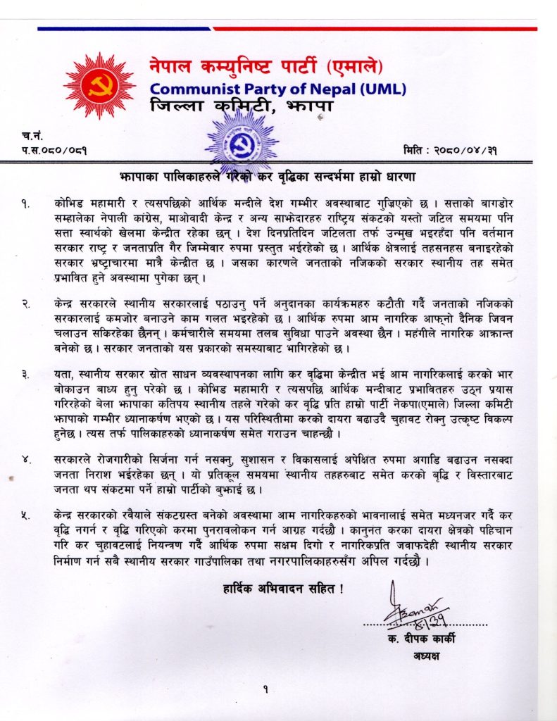 झापा \ नेकपा एमाले झापाले जिल्लाका सबै स्थानीय सरकारहरुलाई कर वृद्धि नगर्न आग्रह र अपील गरेको छ । केन्द्र सरकारको कारण हरेक क्षेत्रमा दुःख पाइरहेका जनतालाई थप दुख नदिन एमालेले आग्रह गरेको हो ।