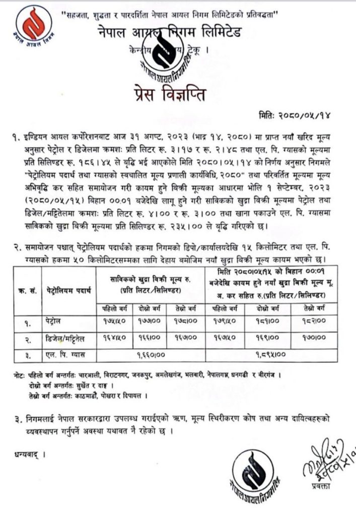 निगमका अनुसार पेट्रोलमा प्रतिलिटर चार रुपैयाँ, डिजेल र मट्टितेल प्रतिलिटर ३ र एलपी ग्यास प्रतिसिलिन्डर २३५ रुपैयाँ बढेको छ ।मूल्य वृद्धि आज राती १२ बजेदेखि लागू हुने निगमले जनाएको छ ।