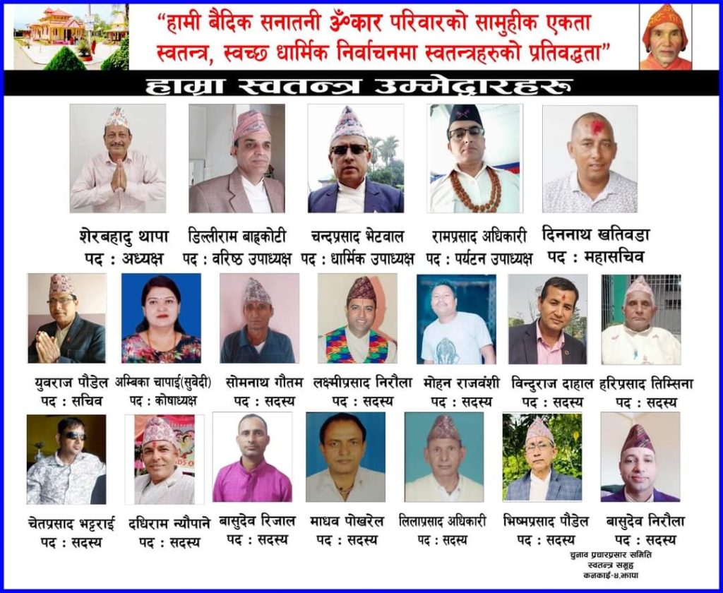 कनकाई ४ कोटीहोम स्थित धार्मिक संस्थाको निर्वाचनमा स्वतन्त्र समुहका तर्फबाट अध्यक्ष पदका उम्मेद्वार शेरबहादुर थापा नेतृत्वको प्यानलले चुनावी प्रचारप्रसारलाई तिब्र पार्दै समुहका तर्फबाट १५ बँुदे प्रतिवद्धता पत्र सार्वजनिक गरिएको हो ।