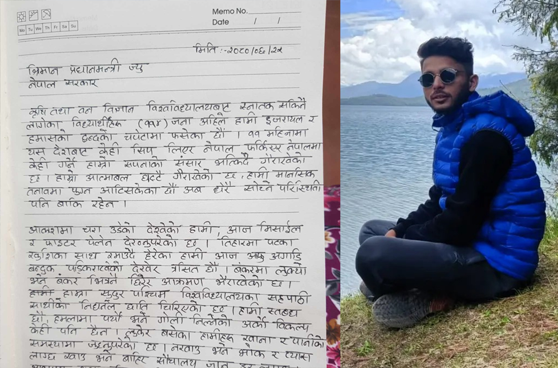 काठमाडौं । इजरायलमा रहेका एक नेपाली विद्यार्थीले प्रधानमन्त्री पुष्पकमल दाहाललाई पत्र लेख्दै उद्दारको पहल गरिदिन आग्रह गरेका छन् ।