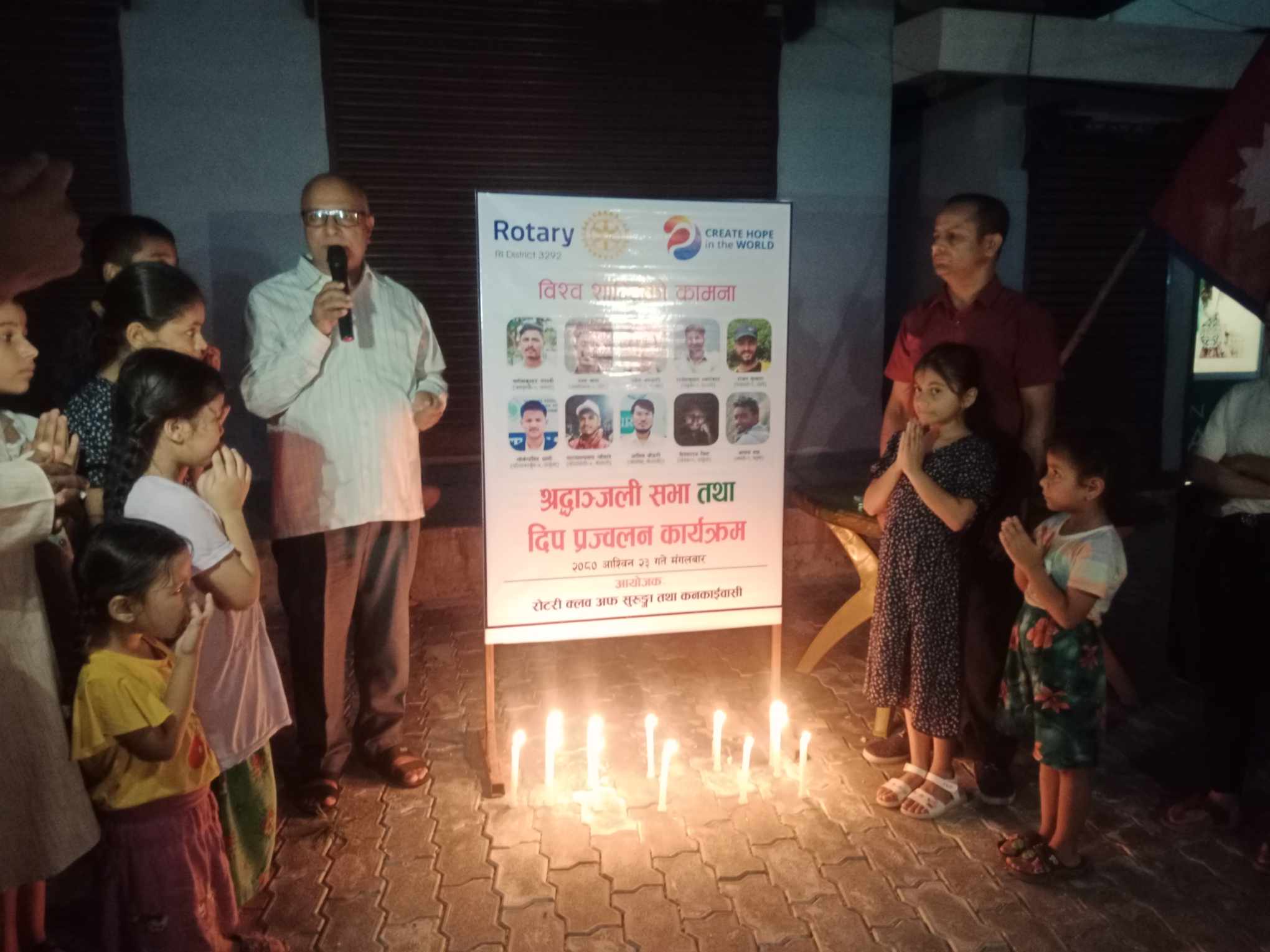 कनकाई खबर \ झापाको कनकाईमा रोटरी क्लव अफ सुरुङ्गाले इजरायलमा हमासले गरेको आक्रमणमा परी मृत्यु भएका नेपाली विद्यार्थीको सम्झनामा श्रद्धाञ्जली सहित दिप प्रज्वलन गरेको छ ।