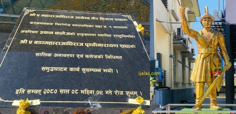 बिर्तामोड \ तामझामका साथ झापाको बिर्तामोड —१ स्थित इकम कलेजले पृथ्वीनारायण शाहको सालिक अनावरण गरेको छ । पूर्व राजा ज्ञानेन्द्र शाहले शनिवार सालिक अनावरण गरेका हुन् । सोही क्रममा इकम कलेजको समेत उद्घाटन गरेका थिए ।