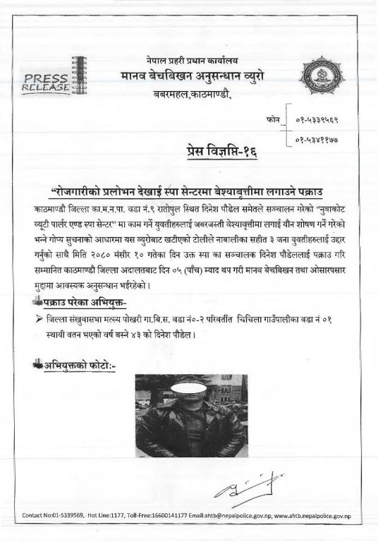 युवतीलाई जबरजस्ती यौन व्यवसायमा लगाई निज स्पा सेन्टरका सञ्चालक पौडेलले आर्थिक लाभ लिने गरेको खुल्न आएको पनि प्रहरीले जनाएको छ ।