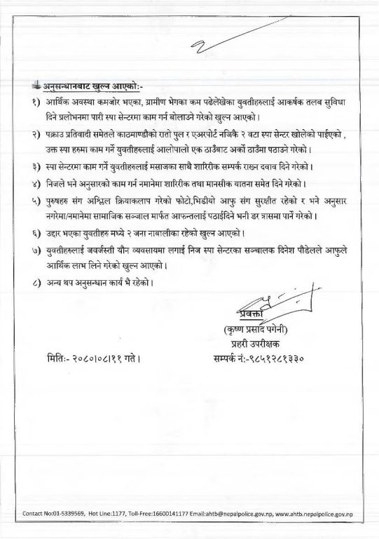 प्रहरीको मानव बेचविखन अनुसन्धान ब्यूरोबाट खटिएको टोलीले नाबालिकासहित तीन जना युवतीलाई उद्धार गरेको छ । उक्त स्पाका सञ्चालक दिनेश पौडेललाई पक्राउ गरी अनुसन्धान थालेको ब्यूरोले सार्वजनिक गरेको हो । उनीमाथि मानब बेचविखन तथा ओसारपसार मुद्दामा आवश्यक अनुसन्धान भइरहेको ब्यूरोका प्रहरी उपरीक्षक कृष्णप्रसाद पङ्गेनीले बताए