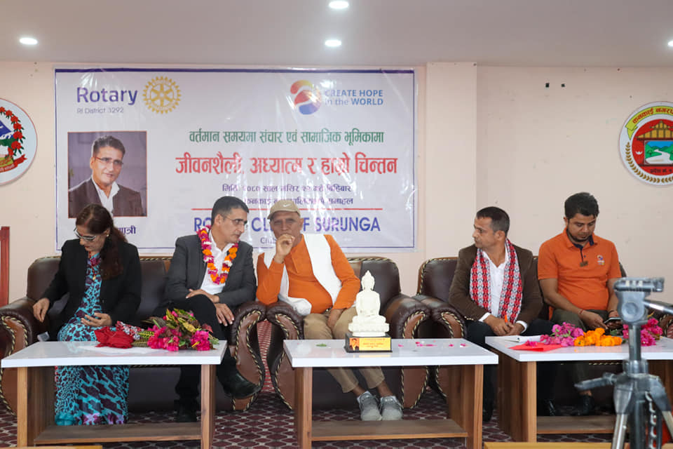 कनकाई खबर \ रोटरी क्लव अफ सुरुङ्गाले वर्तमान समयमा संचार एवं सामाजिक भूमिकामा जीवनशैली,अध्यात्म र हाम्रो चिन्तन विषयक अन्तरसम्बाद कार्यक्रम सम्पन्न गरेको छ ।