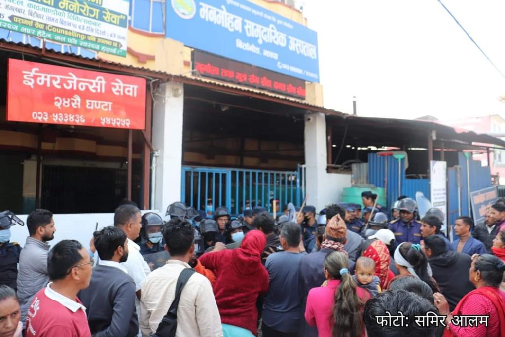 सोही क्रममा उनीहरूले बाहिरबाट ढुंगामुडा गर्दा अस्पतालको सिसाहरू फुटेको छ । अस्पताल हुने सम्भावित तोडफोडको घटनालाई लक्षित गरी ठुलो सङ्ख्यामा प्रहरी परिचालन गरिए पनि उनीहरूले अन्ततः ढुंगामुडा प्रहार गरे । प्रहरीले भने प्रदर्शनकारीमाथि बल प्रयोग नगरेको बताइएको छ ।