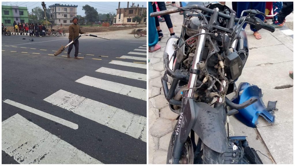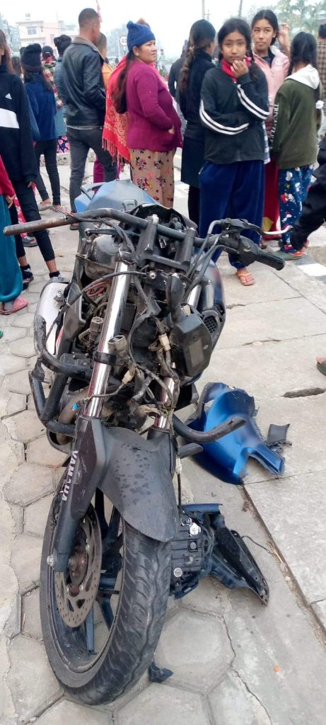 सडक किनारमा रहेको फलामको पोलमा मोटरसाइकल अनियन्त्रित भएर दुर्घटना भएको स्थानीय प्रत्यक्षदर्शीको भनाइ छ । तीब्र गतिमा सुरुंगाबाट दक्षिण तर्फ लागेको मोटरसाइकल सुरुंगाका साउण्ड व्यवसायी दिपेश तिवारीको रहेको बताईएको छ ।