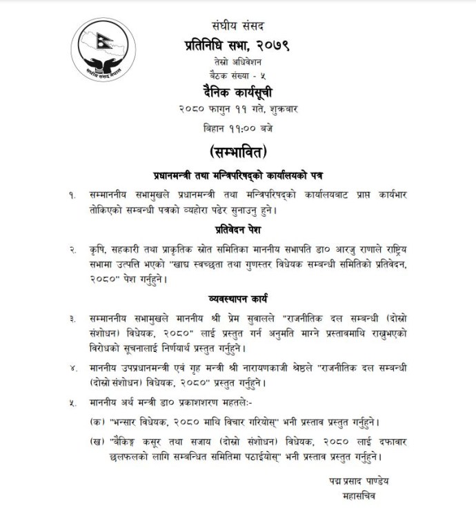 बैठकमा हिजो प्रस्तुत हुन नसकेको विधेयक प्रस्तुत हुने कार्यसूची छ । बैठक सञ्चालनका लागि आवाश्यक संख्या नपुगे पछि बैठक आजसम्मका लागि स्थगित भएको हो ।