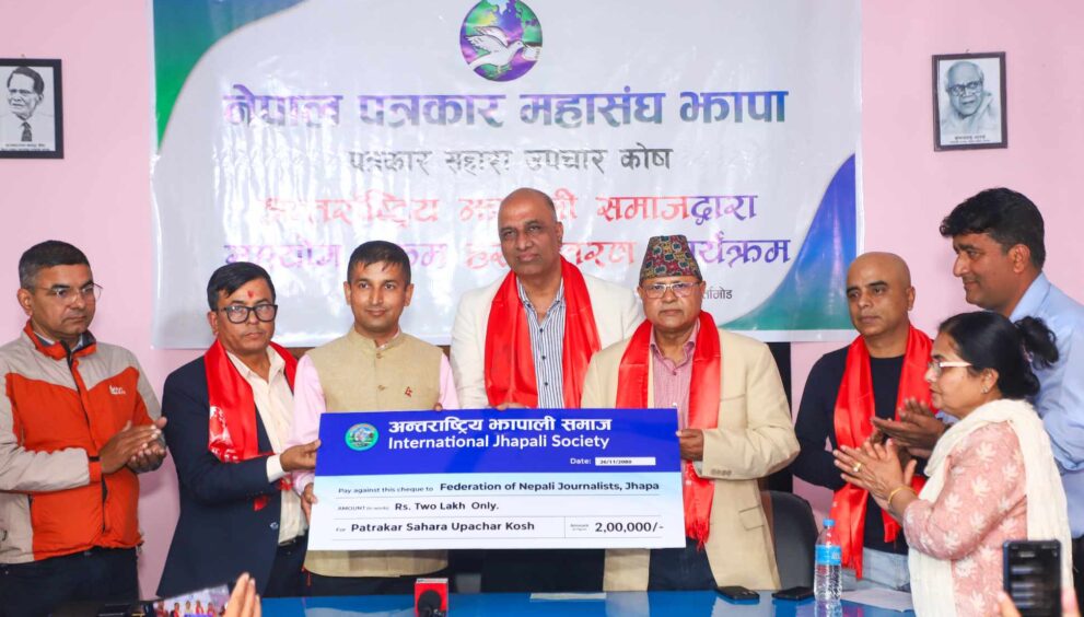 नेपाल पत्रकार महासंघ झापा शाखाले स्थापना गरेको पत्रकार सहारा उपचार कोषमा समाजले शनिबार बिर्तामोडमा आयोजित कार्यक्रमका वीच दुई लाख रुपैयाँको चेक महासंघ झापाका अध्यक्ष एकराज गिरीलाई प्रदान गरेको हो । अन्तर्राष्ट्रिय झापाली समाजका अध्यक्ष मुकुन्द ढुंगाना, संस्थापक अध्यक्ष तथा संरक्षक दीनेशकुमार पोखरेल र मध्यपूर्व क्षेत्रीय सहसंयोजक भवानी कोइरालाले उक्त रकमको चेक हस्तान्तरण गरेका थिए । समाजले यस अघि ५० हजार रुपैयाँ उक्त कोषलाई दिएको थियो । त्यो सहित समाजको सहयोग रकम अढाई लाख पुगेको हो ।