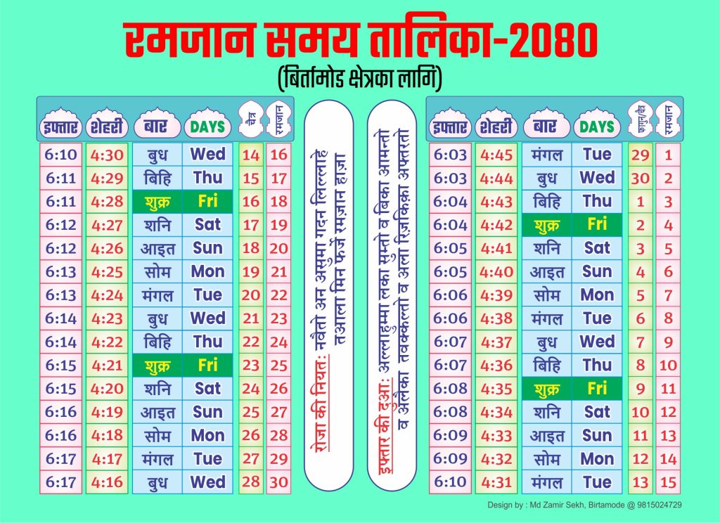 रोजा बस्न बिहान तोकिएको समय अगावै र बेलुका तोकिएको समयपछि आहार लिइन्छ । उर्दू पात्रोअनुसार हिजरी सम्वत्को रमजान नवौँ महिना हो । रमजानमै मुसलमानहरूको सबैभन्दा ठूलो ग्रन्थ कुरान अवतरण भएको हो भने यस महिनामा अल्लाहको कृतज्ञता प्राप्त हुने विश्वास लिइन्छ ।