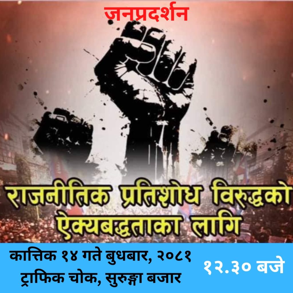 कनकाई खबर \ राष्ट्रिय स्वतन्त्र पार्टी झापाले कात्तिक १४ गते बुधबार १ बजे सुरुङ्गामा बिरोध प्रदर्शन गर्ने भएको छ ।