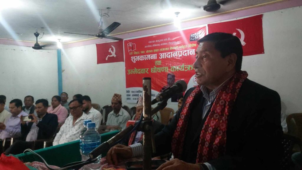 माओवादी केन्द्र वडा समितिको आयोजनामा सम्पन्न शुभकामना आदानप्रदान सहितको उम्मेद्वार घोषणा कार्यक्रममा स्थानीय युवा नेता तथा पार्टीका जिल्ला सदस्य गणेश थापालाई पार्टीका तर्फबाट वडाअध्यक्षको उम्मेद्वारका रुपमा घोषणा गरिएको हो ।