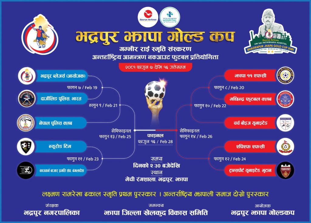 सौर्य एअरलाइन्स ओमसाई पाथिभरा हस्पिटल भद्रपुर झापा गोल्डकप गम्भीर राई स्मृति संस्करण अन्तर्राष्ट्रिय आमन्त्रण नकआउट फुटबल प्रतियोगिता यही फागुन ७ गतेदेखि १६ गतेसम्म हुने आयोजक समितिका अध्यक्ष दिपेश ढकालले बताए ।