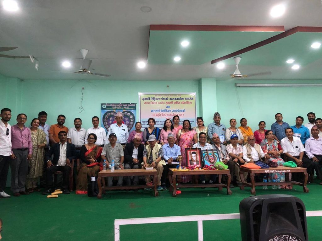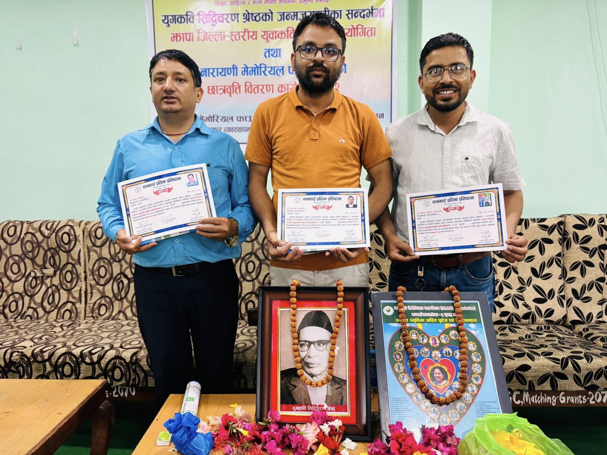 कन्काई प्रतिभा प्रतिष्ठानका कार्यवाहक अध्यक्ष डा. पुण्यप्रसाद सिग्देलको अध्यक्षतामा कविता प्रतियोगिता एवं नारायणी मेमोरियल फाउन्डेसनको शैक्षिक सत्र २०८२ को लागि झापा जिल्लाका २६ वटा विद्यालयका ४० जना छात्र छात्रालाई छात्रवृत्ति वितरण कार्यक्रम सम्पन्न भएको छ । कार्यक्रममा युग कवि सिद्धिचरण श्रेष्ठ एवं नारायणी मेमोरियल फाउन्डेसनको अनन्त स्मृतिमा अङ्कित पूर्वज एवं प्रियजनहरूको स्मृति र सम्मानमा एक मिनेट मौन धारणा गरी कार्यक्रमको सुरुवात गरिएको थियो ।