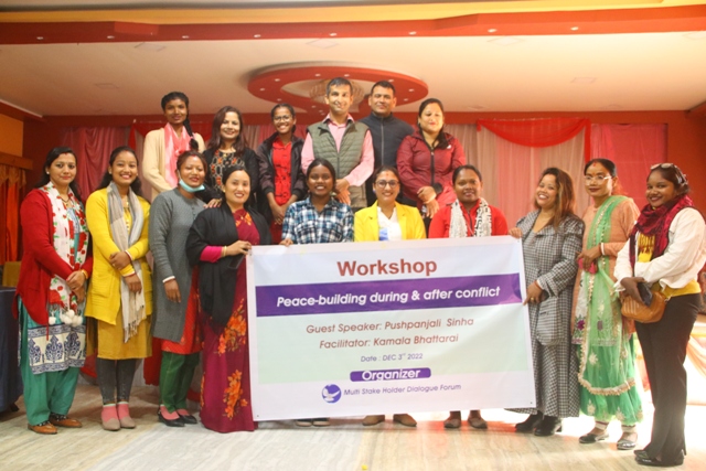 कार्यक्रममा आदिवासी समुदाय राजवंशी र सन्थाल जातिका महिला सहभागी थिए । एभरेष्ट स्मार्ट स्कुलकी प्रिन्सिपल पुष्पाञ्जली सिन्हा र संवाद सहजकर्ता कमला भट्टराईले लैंङ्गिक हिंसा, कानुनी व्यवस्था, शान्ति निर्माण तथा महिला सशक्तिकरणका विषय समेटिएका दुई वटा कार्यपत्र प्रस्तुत गरेका थिए ।