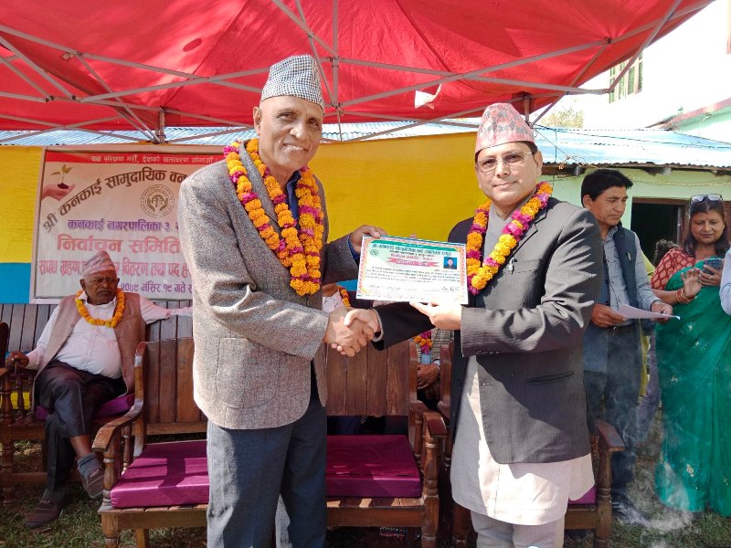 कार्यक्रममा नव निर्वाचित पदाधिकारीहरुलाई निर्वाचन समितिका संयोजक टीकाकुमार पोखरेल, सदस्य चन्द्र मैनाली भतिज , प्रमुख अतिथि कनकाई नगर प्रमुख राजेन्द्रकुमार पोखरेल , कनकाई ३ का वडा अध्यक्ष युवराज चौलागाईं , कनकाई ४ का बडा अध्यक्ष रोशन सुवेदी , सव डिभिजन वन कार्यलय सुरुङ्गाका प्रमुख सुरेशकुमार खनाल , वन संरक्षक देवराज ओझा लगायतका अतिथिहरुले प्रमाण पत्र वितरण गरेका थिए ।