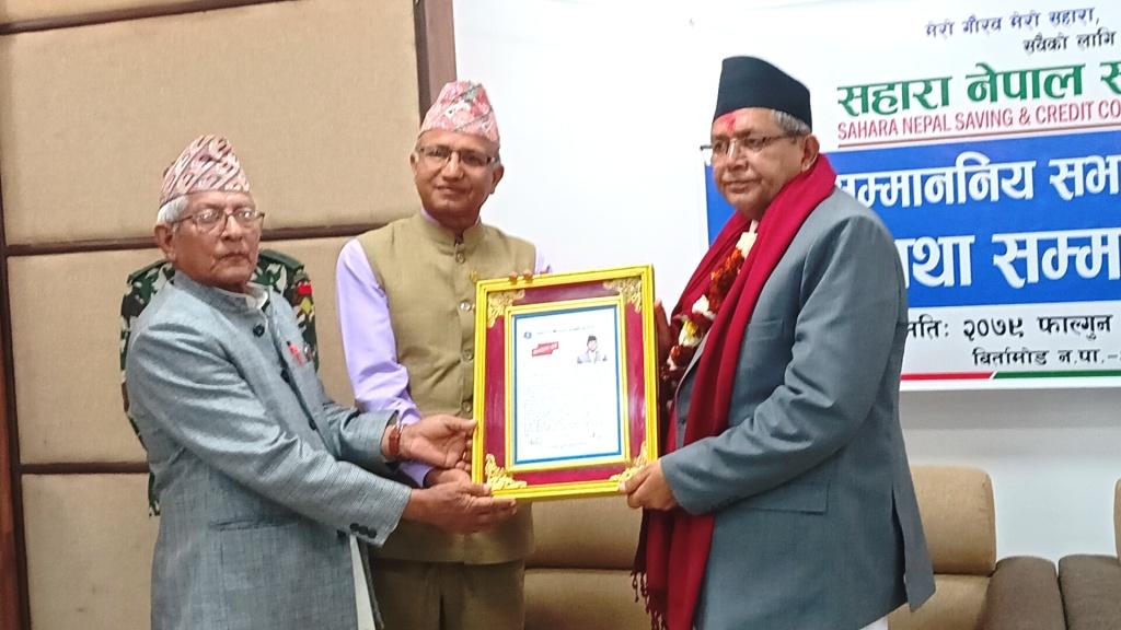 संस्थाको १९७३ नंं. का सेयर सदस्य रहेका सभामुख घिमिरेलाई सहारा नेपाल साकोसले संस्थाको कार्यालयमै आमन्त्रण गरी संचालक समिति, कर्मचारी साथै सेयर सदस्यहरु विचमा दोसल्ला ओडाएर सम्मानपत्र तथा मायाको चिनो प्रदान गर्दै सम्मान गरेको हो । सहारा साकोसका अध्यक्ष हरिबहादुर राजवंशी, वरिष्ठ उपाध्यक्ष हरिप्रसाद निरौला, कार्यकारी प्रमुख महेन्द्रकुमार गिरी लगायतले सभामुख घिमिरेलाई संस्थाका तर्फबाट सम्मान गरेका हुन् ।