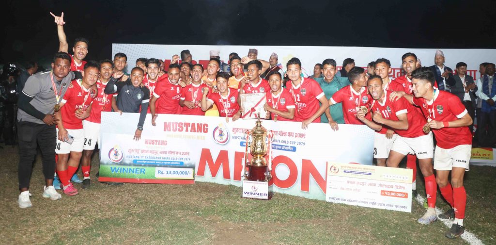 भद्रपुर \ प्रथम मुस्ताङ भद्रपुर झापा गोल्डकपको उपाधि त्रिभुवन आर्मी फुटबल क्लबले जितेको छ ।