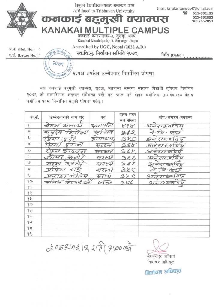 त्यस्तै कोषाध्यक्षमा निर्वाचित भएकी अनेरास्ववियुकी प्रिया पुरीले ३५८ मत प्राप्त गरिन् । सदस्यहरुमा निर्वाचित क्रमशः मीना ढुङ्गेलले ३९४, रोहन कोइरालाले ३७५, जेमर अलीले ३६६, मदन उप्रेतीले ३६२, प्रविन राई (नेविसंघ)ले ३५९, प्रकाश गौतमले ३५९ र मनिस हिङमाङ दर्जीले ३४७ मत प्राप्त गरी विजयी बनेको निर्वाचन आयुक्त सेरबहादुर बानियाँले जानकारी दिए । कनकाई बहुमुखी क्याम्पस सुरुङ्गामा १ हजार ३ सय ७१ मतदाता रहेको भएपनि ८३२ मत खसेको बताइएको छ ।