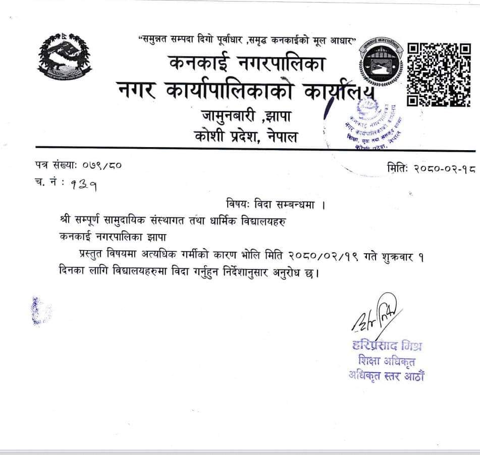 अत्यधिक रुपमा गर्र्मी बढेपछि झापाको कनकाई नगरपालिका, मेचीनगर र कचनकवलले पालिकाभित्र सञ्चालित विद्यालय विदा गर्न सूचना गरेका छन् । कनकाई नगरपालिकाका शिक्षा शाखा अधिकृत हरिप्रसाद मिश्रले हस्ताक्षर गरेको सूचनामा अत्यधिक गर्मीका कारण २०८० जेठ १९ गते शुक्रबार एक दिनकालागी नगर क्षेत्रभित्रका सम्पूर्ण सामुदायिक, संस्थागत तथा धार्मिक विद्यालयहरु विदा दिने निर्णय भएको बताइएको छ ।